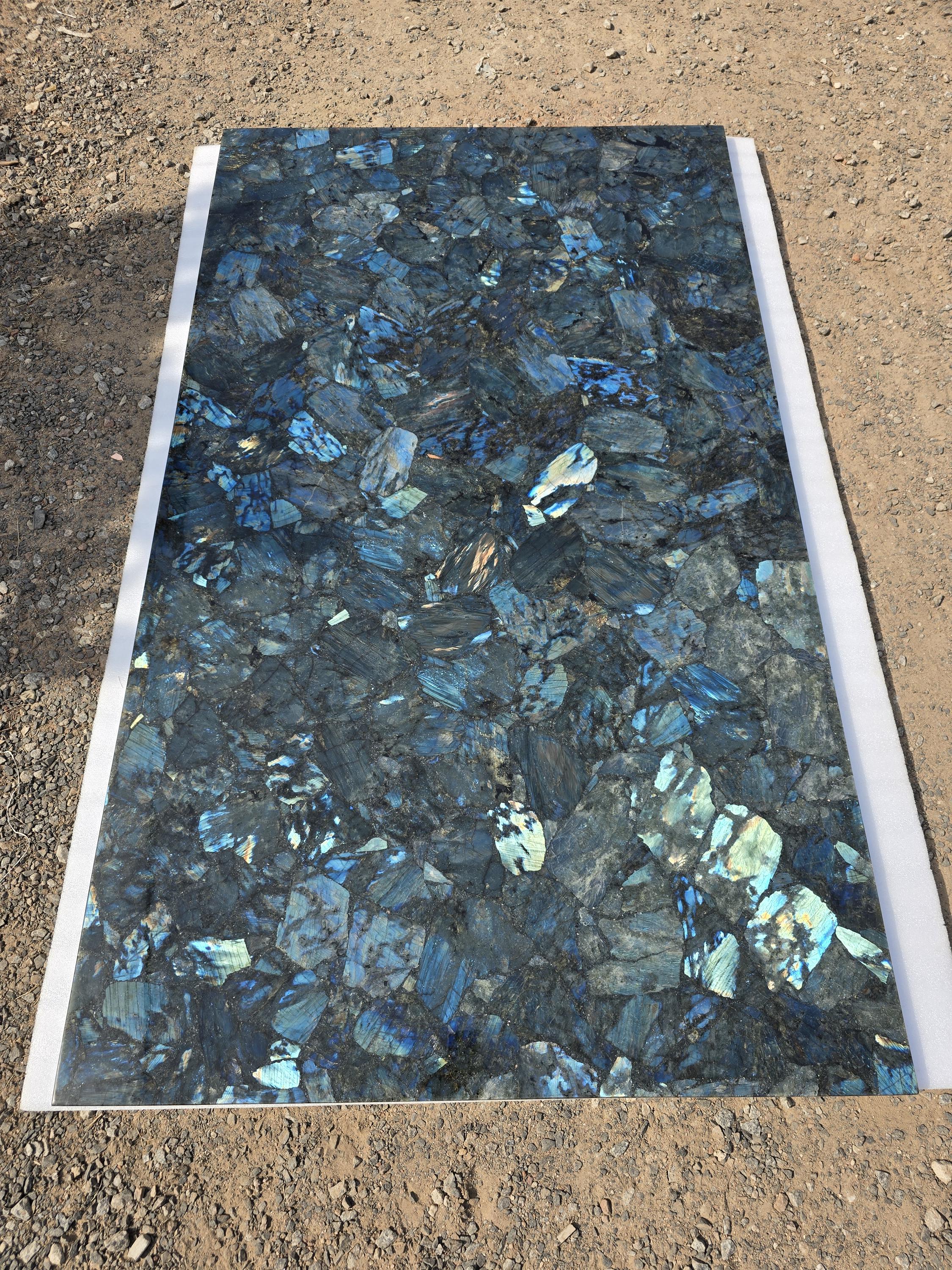 Upgrade your kitchen or bathroom with this breathtaking rectangular labradorite slab counter top! Made from genuine labradorite gemstone, each slab features dazzling blue and green iridescent flashes, intricate crystal veining, and a mirror-polished surface that will transform your space. Each piece is artisan-cut, ensuring a one-of-a-kind luxury installation for kitchen counters, islands, or vanity tops.
